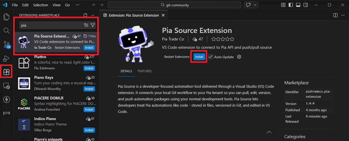 The VS Code extension for Pia Source can be downloaded from the VSCode Extension marketplace (Marketplace icon on the left and search Pia).