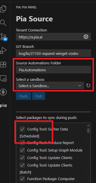 For the extension to work correctly, make sure you are connected to a repo in your local VSCode and have a branch open. The extension will detect the branch and allow you to select a sandbox to pull from Pia down to your local. You can specify the "Source Automations Folder" which is the folder Pia will use inside the workspace to place the automations. Once pulled to local, you can just use the Source Control features of VSCode to commit to the repo (Pia Source doesn't directly commit code to your GIT Repo - you can use the native source control features of VSCode to achieve this).