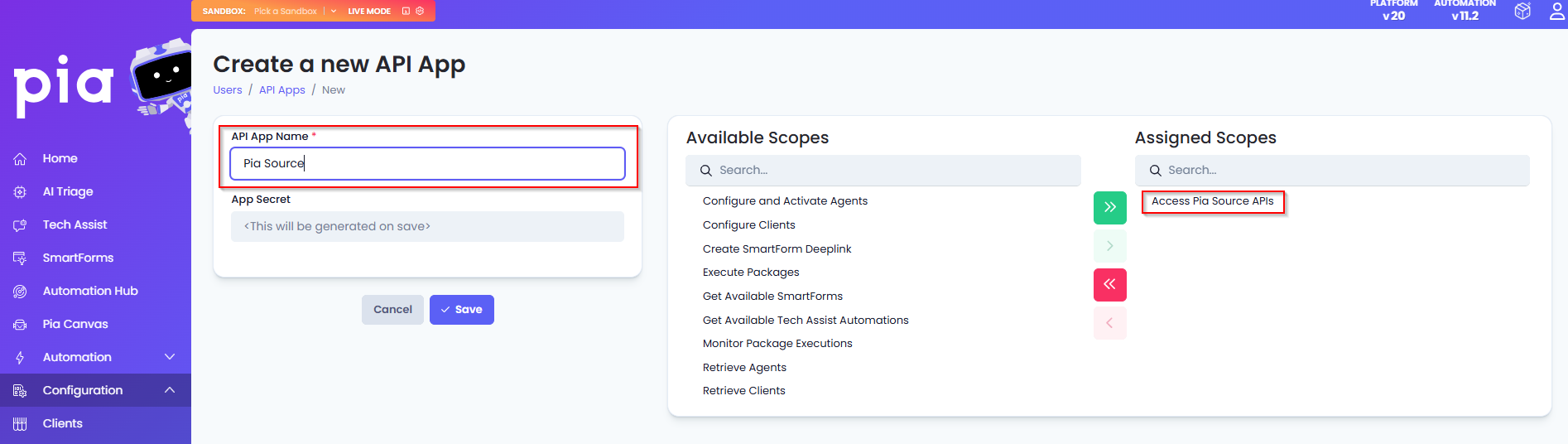 Step 4: Set the name as "Pia Source" and assign "Access Pia Source APIs" scope to this new App