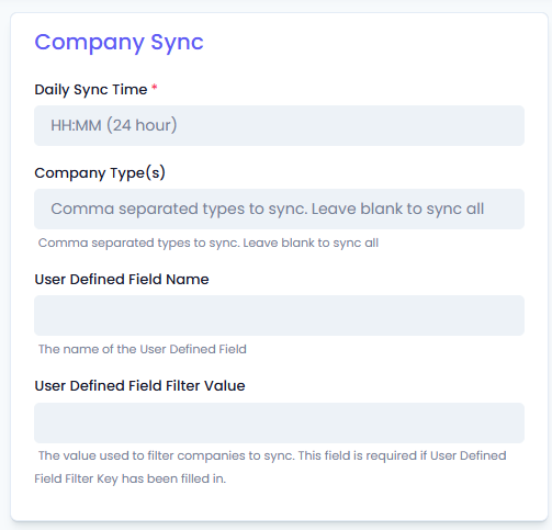 - Daily Sync Time: Enter the time that companies will be synced each day