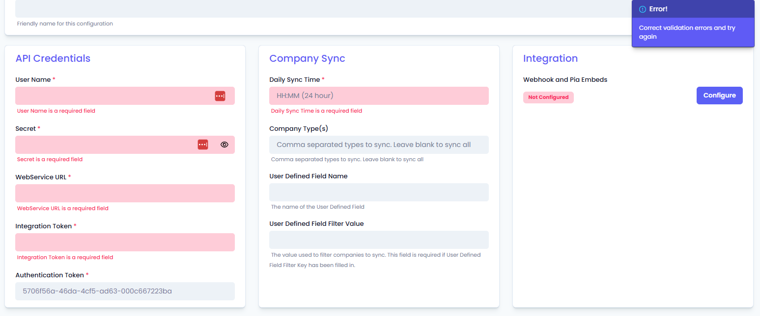 - Integration Token: Enter the Tracking Identifier value that was generated when creating your Pia API account in AutoTask