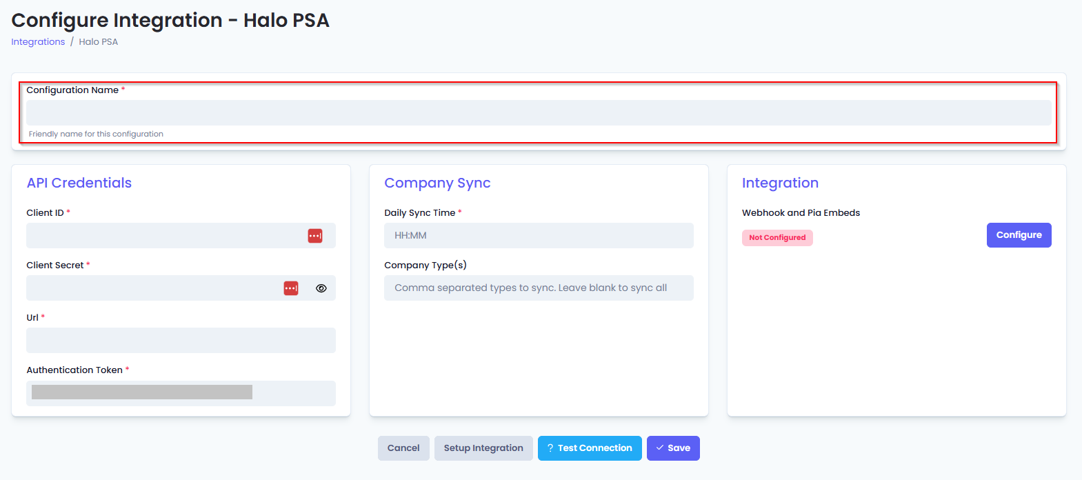 - Click on the "Configure" button available in the widget for Halo PSA. This will take you to the configuration page for Halo PSA.