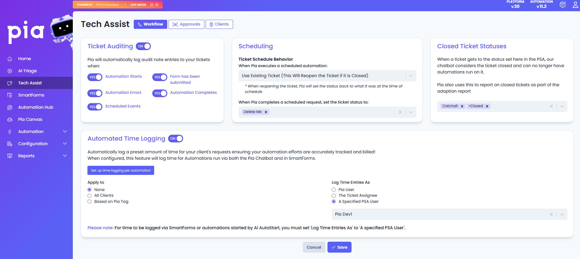 The Workflow tab within Tech Assist lets you control how Pia interacts with the tickets in your PSA. This also include requests that are submitted via SmartForms and later processed through Pia's chatbot. Several settings that were previously scattered across the portal have now been consolidated here, making it easier to manage and centralize all tech assist related configuration in one place.