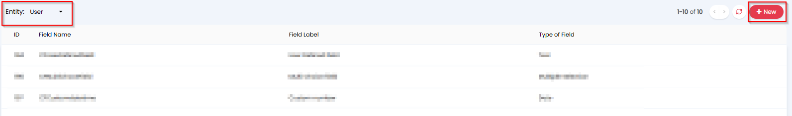 Step 5: In the Custom Fields screen, select the Entity to "User" and click on the "New" button