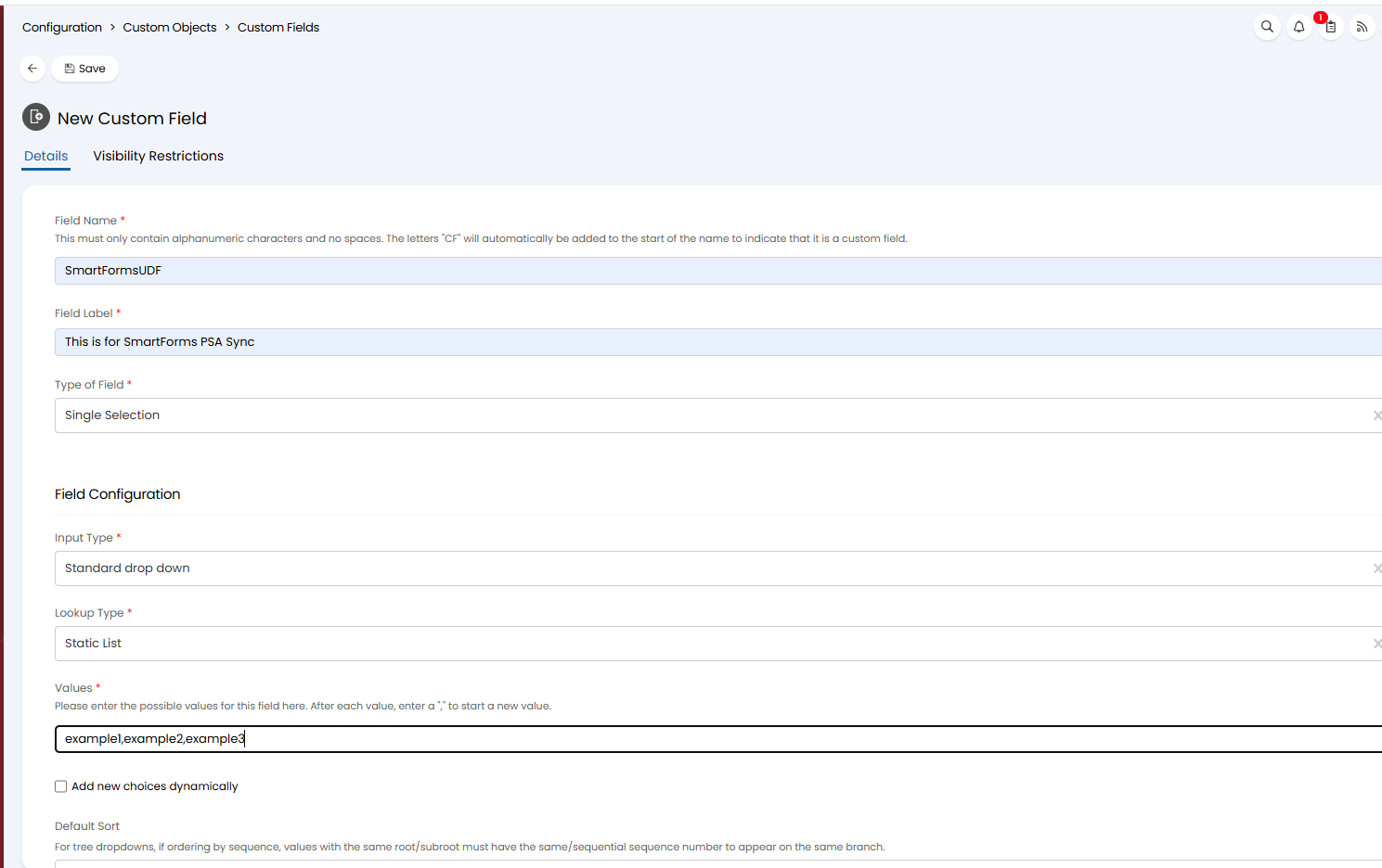 - Values: Set the values you want the user to be able to select in a drop-down when they set this custom field for the contact. Use this format: example1,example2,example3 for multiple options.
