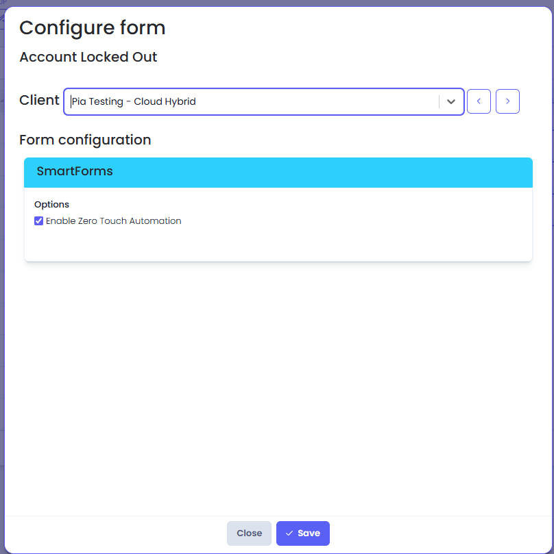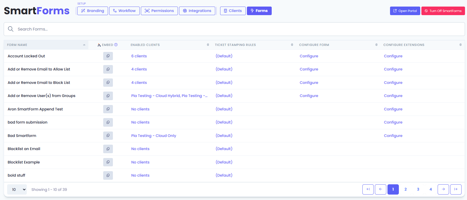 You can use the Forms tab in this screen to modify the form setup such as enabling the form for multiple clients at once, setting up individual ticket stamping rules for each SmartForm and configuring form details (enabling zero touch automation).