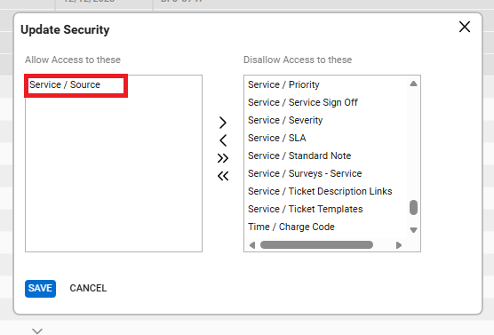 For Partners that use ConnectWise PSA, you will need to use the Service/Source Permission in the table setup for this feature to work (located in Settings Icon>Security Roles>Select the security role>System> Table Setup>move the Service/Source to the allow box> click Save).