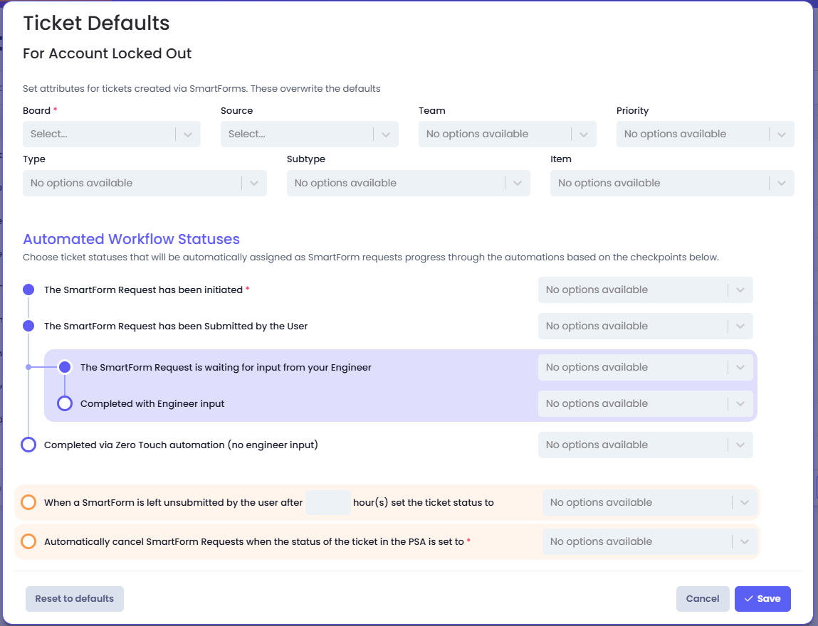 - Source: Select a source of the request from your ticketing system which will be set on your SmartForms ticket.
